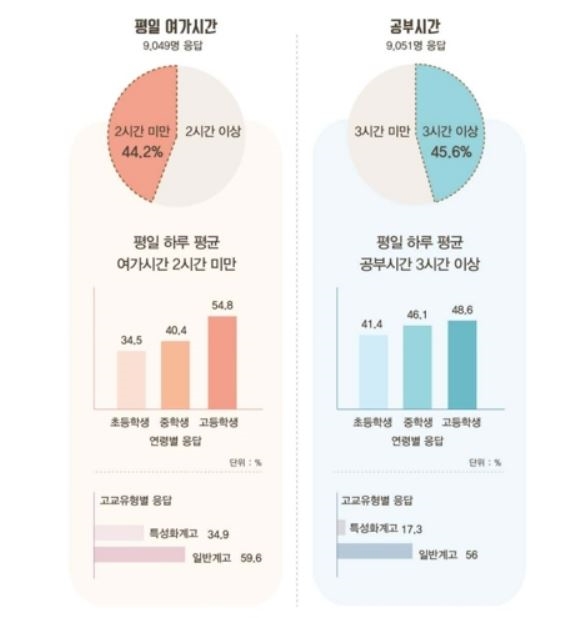 반면 여가는 짧아 하루 2시간 미만이라고 응답한 경우가 44.2%에 달했다. 학교급별로는 고교생 54.8%, 중학생 40.4%, 초등학생 34.5%로 응답했다.