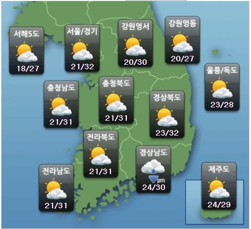 지역별 아침 예상 최저기온은 서울 21도, 인천 22도, 춘천 20도, 강릉 21도, 대전 21도, 대구 23도, 부산 25도, 전주 21도, 광주 21도, 제주 24도다.
