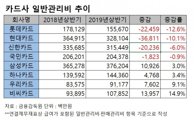 다른 카드사들도 일반관리비가 제자리수준이거나 늘어나더라도 증가폭이 크지 않은 편이었다.