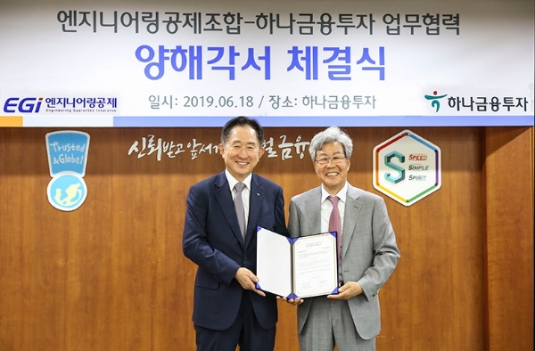 이미지 확대보기이진국 하나금융투자 사장은 “엔지니어링공제조합의 신규사업 추진 관련해 금융주선을 비롯한 금융자문업무의 협력 역할을 하게 돼 매우 기쁘게 생각한다”며, “축적한 풍부한 금융 노하우가 양사 발전에 있어 많은 도움이 되기를 바란다”고 말했다.