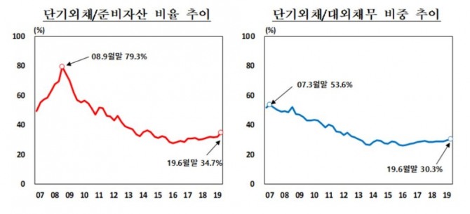 대외채무 중 단기외채 비율과 단기외채 비중은 각각 34.7%, 30.3%로 전분기 보다 각각 2.8%포인트, 0.9%포인트 상승했다. 이는 2014년 9월 말 33.2% 이후 최고치다.