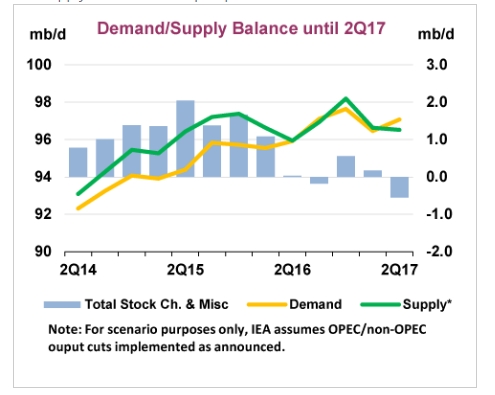 IEA는 이 보고서에서 OPEC의 감산에 무관하게 원유 공급과잉 현상이 지속될 것으로 내다봤다(별표 참조)