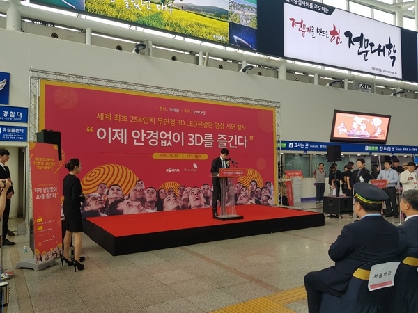 이미지 확대보기3D디스플레이 전문기업 오버다임(대표 강철수)과 코레일은 19일 서울역사에서 세계 최대 규모인 254인치 무안경 3D LED 디스플레이 시연행사를 가졌다. 이번 행사는 코레일이 주최, 오버다임이 주관했다.