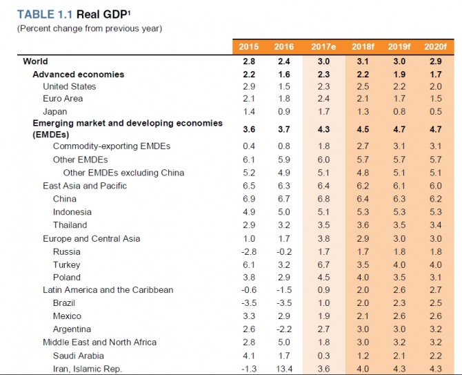 전 세계의 성장률 전망 평균치는 3.1%로 나타났다. 세계은행이 2018년 세계 경제전망(Global Economic Prospects) 보고서에서 밝힌 내용이다. 이는 2017년 6월 세계은행이 제시했던 올해 세계 경제 성장률 전망치보다 0.2% 포인트 오른 수치다. 세계경제의 회복세가 그만큼 확연해졌다는 의미이다. 세계은행은 또 2019년에는 3.0%, 2020년에는 2.9%의 성장률을 올릴 것으로 전망했다.
