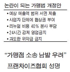 한 가맹본부 관계자는 "프랜차이즈법은 정치권이 최근 `갑을 논란'에 매몰돼 프랜차이즈라는 산업 특성을 전혀 고려하지 않고 만든 횡포"라고 불만을 털어놓았다.