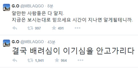 ▲엠블랙맴버지오가자신의트위터에남긴글이다.사진=지오트위터이미지 확대보기